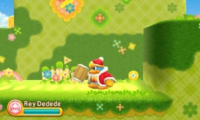 In some levels where Kirby wouldn't normally do much and probably wouldn't travel far, King Dedede comes and offers Kirby a lift. When controlling Dedede, the player will find that he can't do multiple jumps, but he can swing a hammer, which can break objects that Kirby couldn't, such as large walls or boulders. He can also charge his hammer, but it won't do any extra damage.