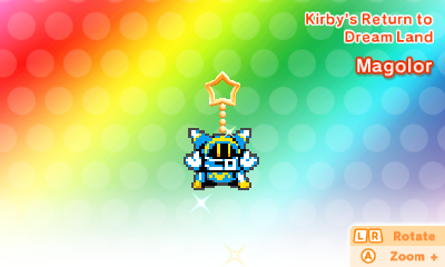 Aside from that, a commemorative gold 8-bit statuette of Magolor is visible in the museum mode and also appears as one of Stone Kirby's transformations. Magolor also appears in the credits, escorting Kirby across the screen as the credits roll underneath. As the credits finish rolling, Magolor returns to the Lor Starcutter and bids Kirby farewell before flying away.