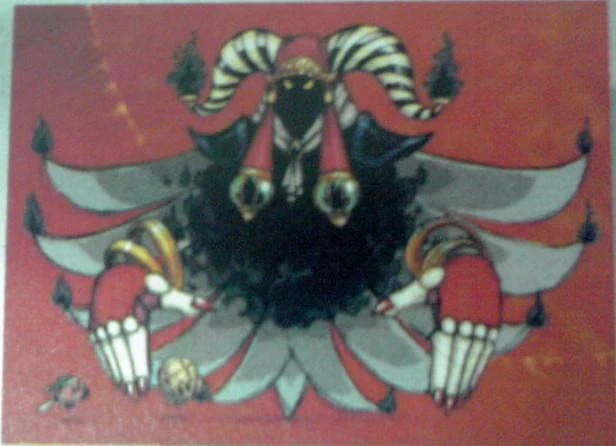 After being defeated by the Ultra Sword, the Master Crown malfunctions and takes control of Magolor.[1] Magolor's hat now grows to enormous proportions and becomes even more curved at the ends, now resembling a ram's horns. The Master Crown has sprouted golden tentacles that wrap around Magolor's horns and head. Magolor's red, gaseous body reforms itself to become two large wings outlined in blue that are set behind his hat and a pair of smaller ones located at his base. Magolor has a pair of red eyes and an empty white grin on his face, while his hands now have black finger-tips. Magolor periodically shuts and opens his mouth to reveal an eyeball with a red iris and a black pupil (very similar to Dark Matter and, to a lesser extent, 0 and 02) in place of that vacant grin. Magolor's face is entirely black, with a droplet of his upper lip dripping over his "grin" to connect with his lower lip, giving him the appearance of slightly melting.