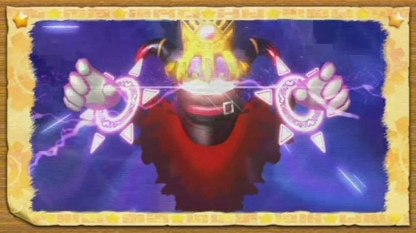 After Landia is defeated, the golden crown it was wearing falls to the ground and Magolor appears, applauding ominously. He grabs the crown from the ground and puts it on his head, simultaneously revealing it to be the Master Crown. It gives Magolor great powers and he takes on a new form somewhat resembling a jester. Meanwhile, the gang is completely dumbfounded and horrified by his unforeseeable deceit. Now with the crown in his possession, Magolor can go on to take complete control of the entire universe, starting with world domination on Planet Popstar as "thanks" for Kirby helping him. Kirby and company set out to stop Magolor, with the help of the now awakened Landia.