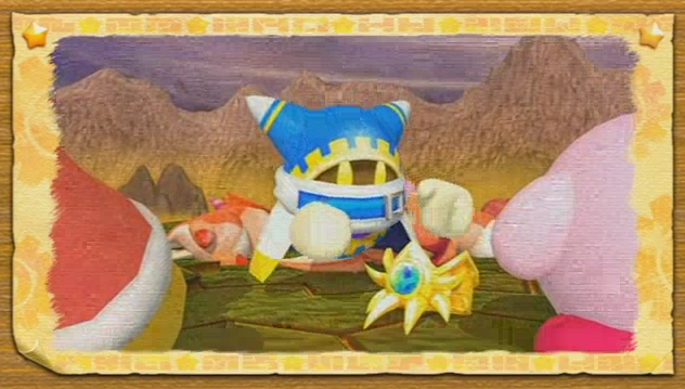 Though he does not physically appear in the game, Magolor makes several cameo appearances in Kirby: Triple Deluxe: